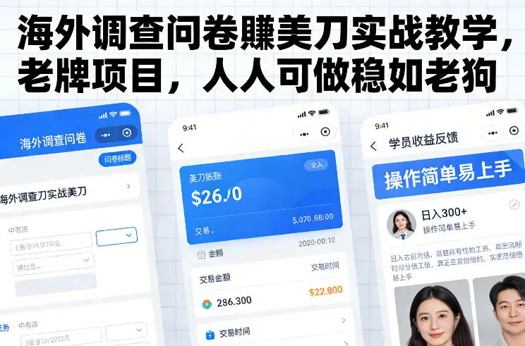 賺美刀从来都不是遥不可及的事,也不是只有专业人士才能做到!这款海外调查问卷賺美刀实战教学课,依托老牌稳当项目,主打“人人可做、稳如老狗”,0基础可学、碎片时间可做、正规合法有保障,手把手教你从0到1解锁海外问卷賺美刀全流程,不用懂英文、不用有经验,只要愿意付出时间,就能持续賺取美刀。不管你是想补贴家用的宝妈、想增收的上班族,还是想轻资产创业的小白,跟着课程学、跟着步骤做,就能轻松抓住海外问卷的红利,实现“动动手指,賺遍全球”的增收目标,踏实賺美刀、稳定不踩坑!